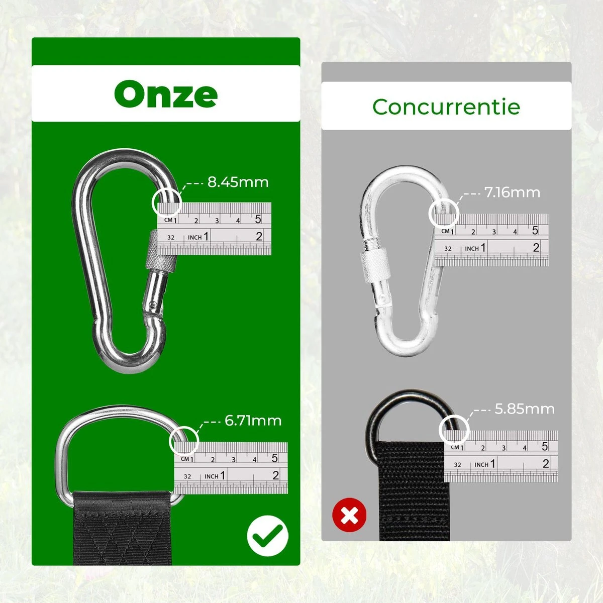 De beveiliging set kan tot wel 1000 kilogram weerstand aan. De set is boomvriendelijk en bestaat uit twee ophangkoorden met haken. In totaal zijn de koorden 150 cm lang per stuk.