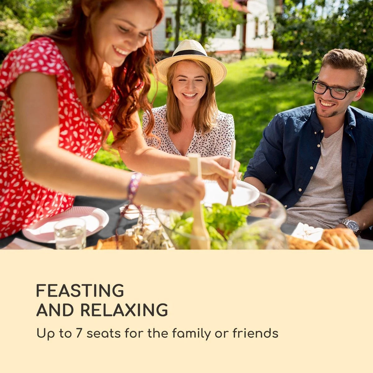 Met de Blumfeldt Titania Dining Lounge Set zitgroep vindt ieder lid van de familie zijn plek om buitenshuis te ontspannen: hetzij op de hoekbank met vier zitplaatsen, hetzij op één van de drie taboeretten – tot zeven personen kunnen het zich, dankzij Family Comfort, gemakkelijk maken aan de grote eettafel en van de gezamenlijke tijd genieten. Een genot zijn ook de knuffelig zachte zitkussens die met 8 cm dikte nauwelijks ruimte voor meer wensen open laten. Maar mochten die er nog zijn dan worden die door de vijf donzige bankkussen van 20 cm vervuld – hiermee voelt u zich direct in de wolken. Bijzonder praktisch is ook de grote eettafel van de Blumfeldt Titania Dining Lounge Set eethoek: op de grote, 120 x 55 cm, breukresistente glasplaat is voldoende plaats voor verfrissende dranken, lekkere snacks of een koffieservies – en met een veeg van een vochtige doek is elk spoor van de gezelligheid weer verdwenen.